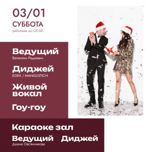 Ведущий Валентин Радкевич Диджей EGRX / MANGUSTICH Живой вокал. Гоу-Гоу 20:00 — 06:00 КАРАОКЕ Ведущая Диана Овсянникова